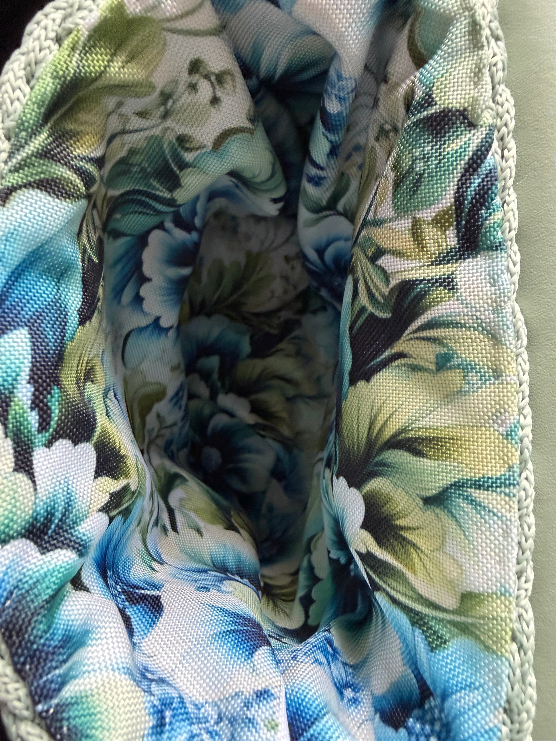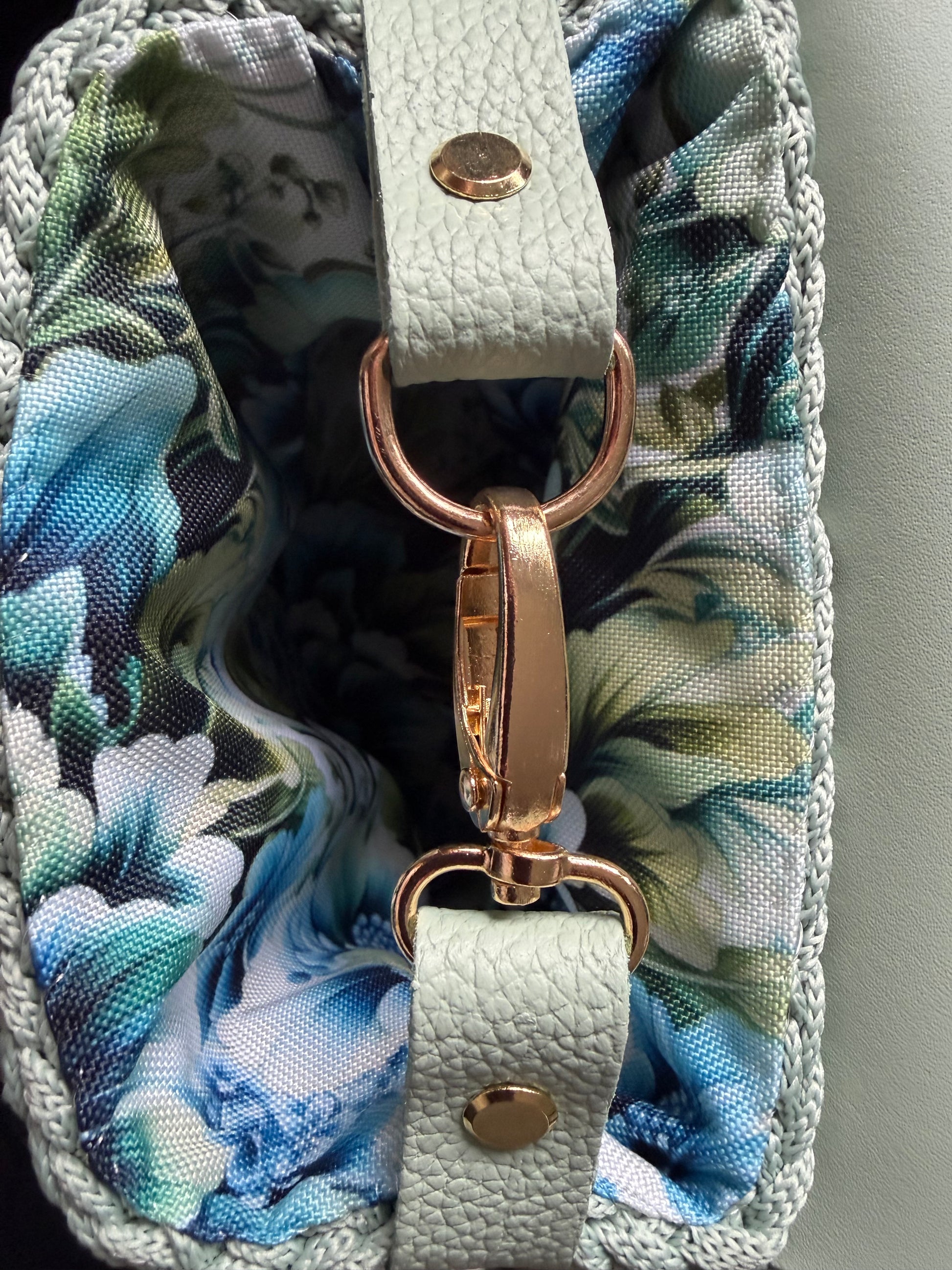 - Außenmaterial: gehäkelter Stoff & natürliches Leder