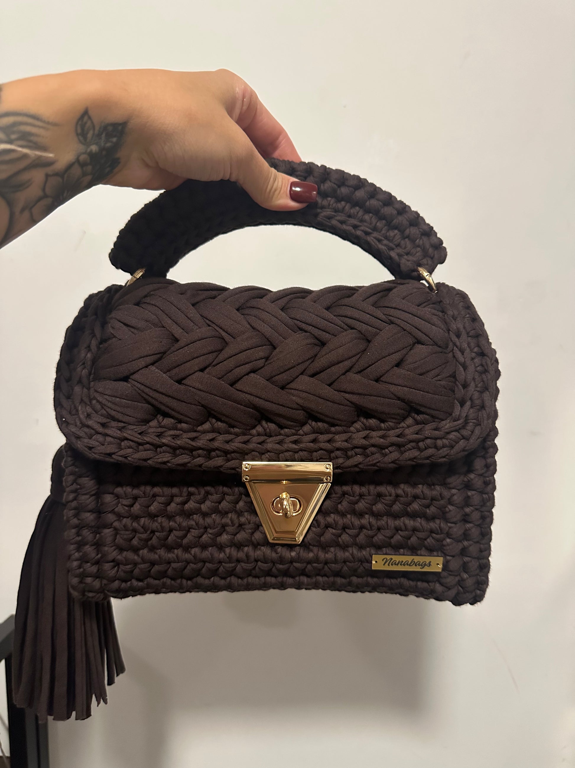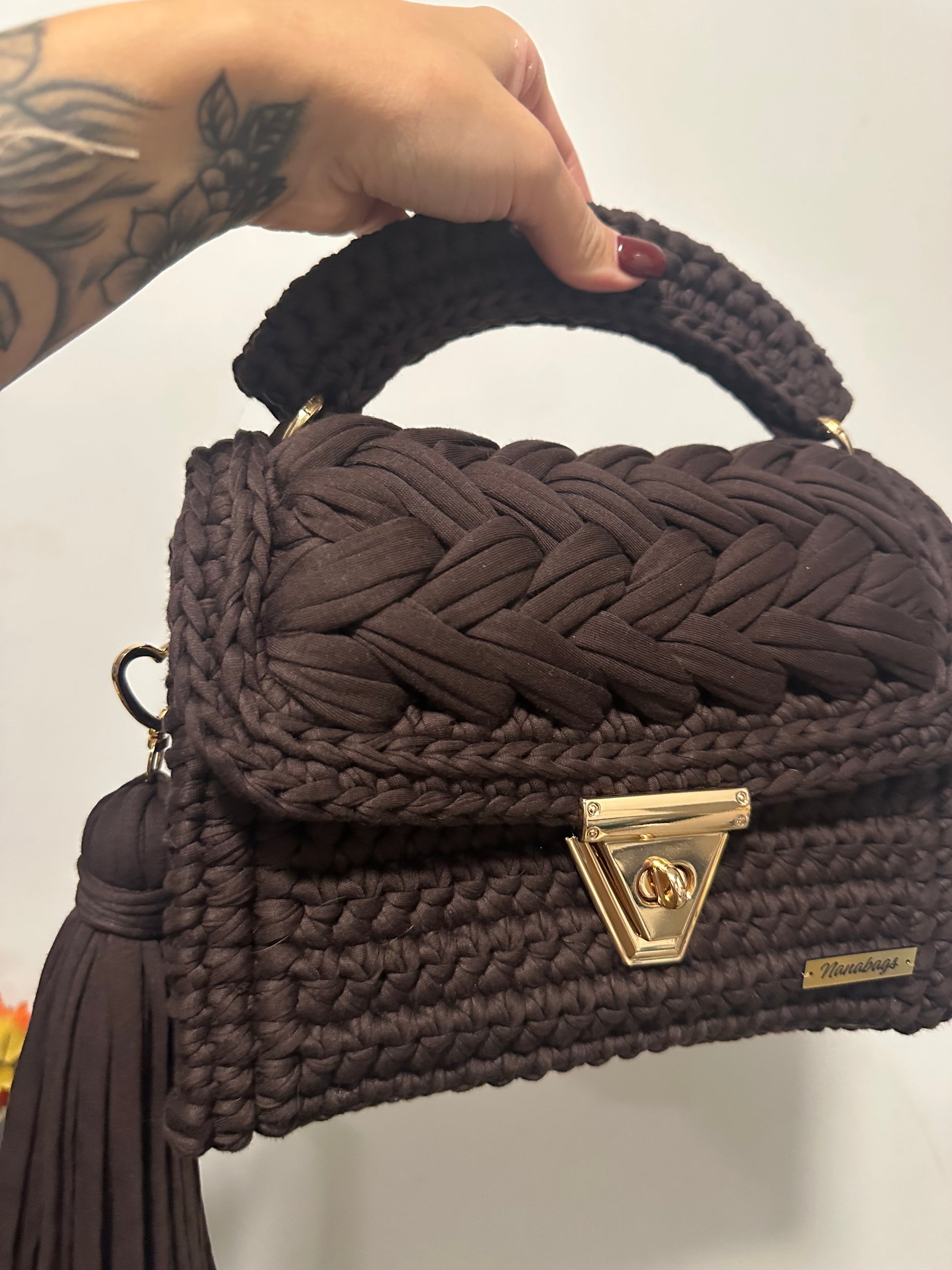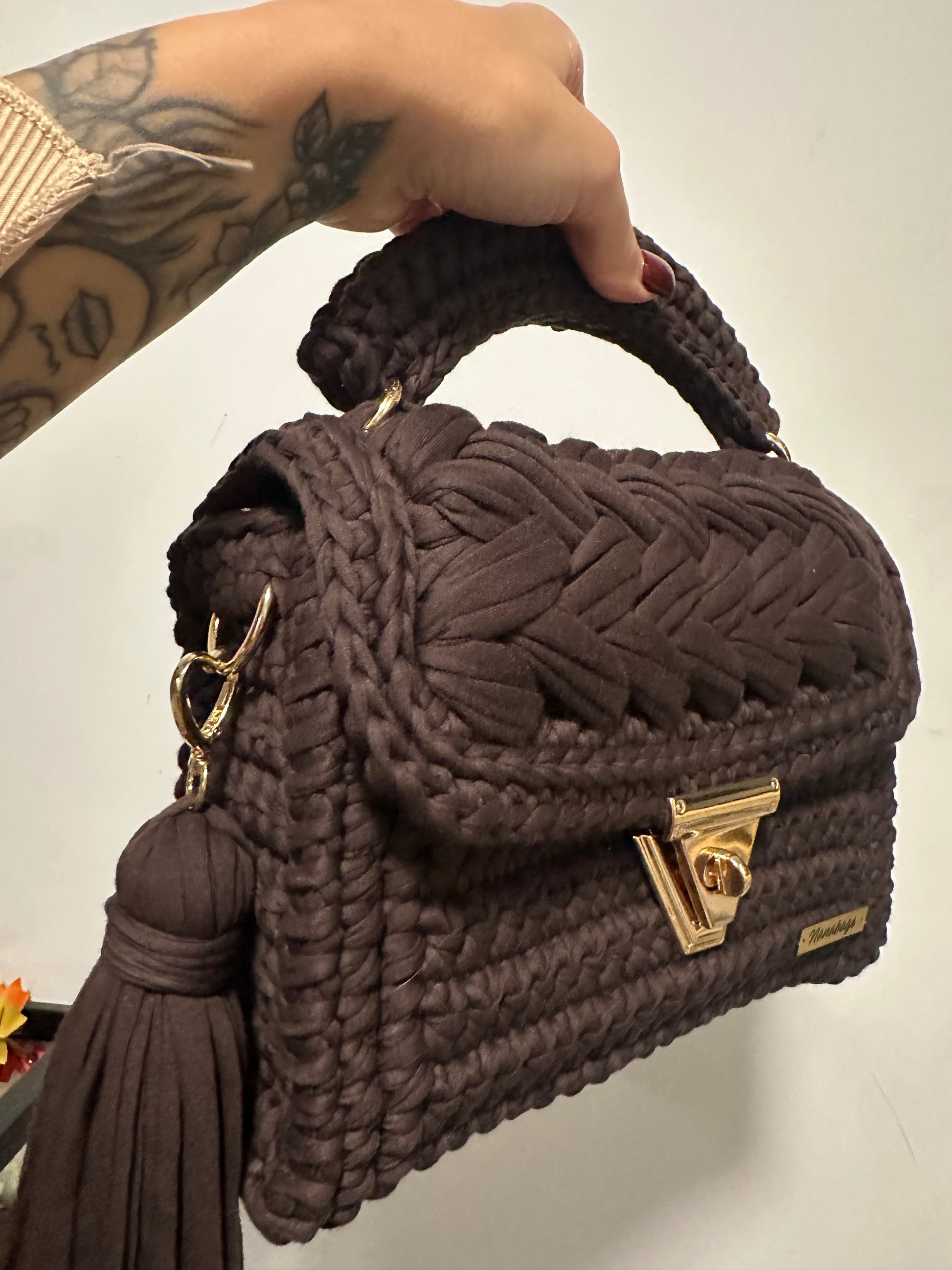 Diese stilvolle, handgehäkelte Tasche in schokobraun Farbe ist ein echter Hingucker und vereint modernes Design mit liebevoller Handarbeit.